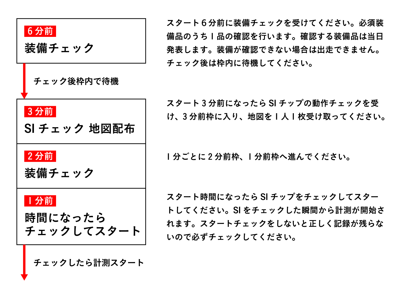 計測読み取り後に装備チェックを行う場合があります。指定された必携装備品を確認できない場合は失格とします。
