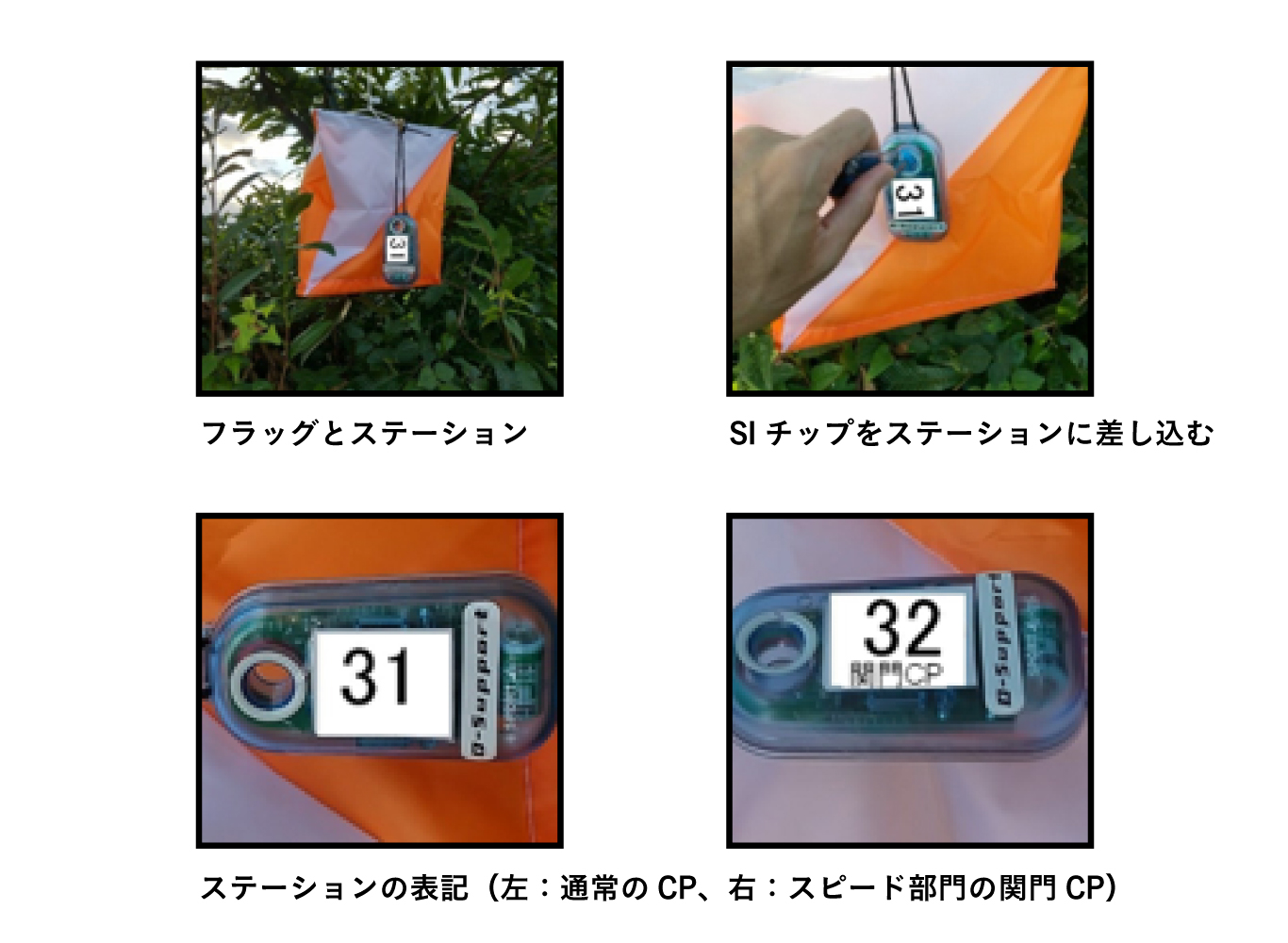 地図上に示されたチェックポイント(以下CP)を回ります。どのCPを目指すか、どの順番で回るかはチームの判断次第です。すべてのCPには写真のようなフラッグが設置されており、ステーションと呼ばれる小さなボックスを吊り下げてあります。ステーションの表面にはCP識別番号(=スコア部門のCP得点)が記載されています。